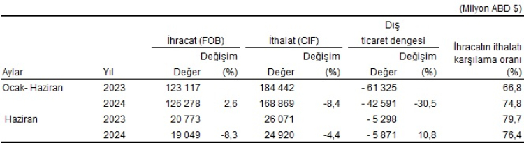 Türkiye İstatistik Kurumu ile Ticaret Bakanlığı iş birliğiyle genel ticaret sistemi kapsamında üretilen geçici dış ticaret verilerine göre; ihracat 2024 yılı Haziran ayında, bir önceki yılın aynı ayına göre yüzde 8,3 azalarak 19 milyar 49 milyon dolar, ithalat yüzde 4,4 azalarak 24 milyar 920 milyon dolar olarak gerçekleşti.