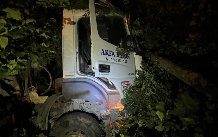 Çarpışmanın etkisiyle beton mikseri yoldan çıkıp şarampole düştü.