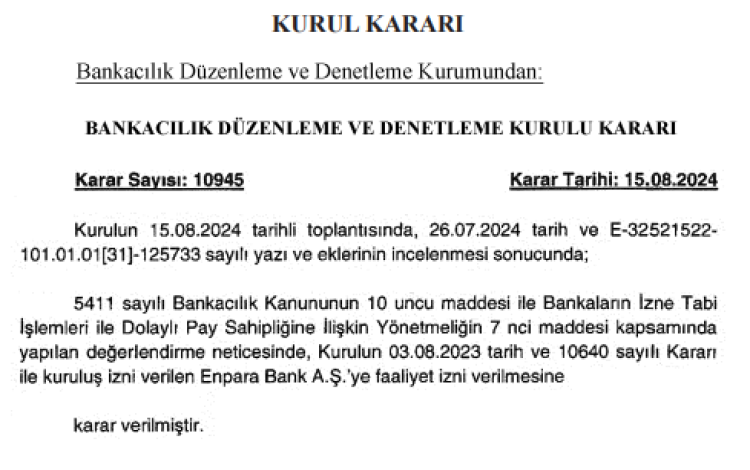 Bankacılık Düzenleme ve Denetleme Kurumu’nun (BDDK), Enpara Bank AŞ’ye Bankacılık Kanunu’nun 10. maddesi ve Bankaların İzne Tabi İşlemleri ile Dolaylı Pay Sahipliğine İlişkin Yönetmeliğin 7. maddesi çerçevesinde 3 Ağustos 2023 tarihinde faaliyet izni verilmesini kararlaştırmıştı.
