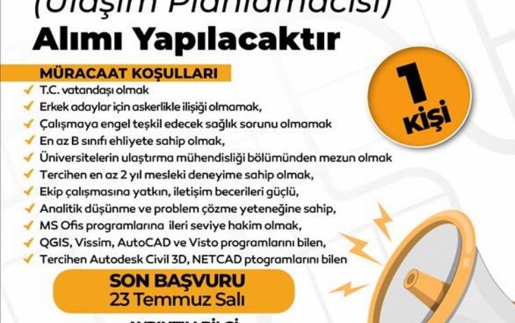 Ulaştırma Mühendisi için; Erkek adaylar için askerlikle ilişiği olmamak, çalışmaya engel teşkil edecek sağlık sorunu olmamak, en az B sınıfı ehliyete sahip olmak, üniversitelerin ulaştırma mühendisliği bölümünden mezun olmak, tercihen en az 2 yıl mesleki deneyime sahip olmak, ekip çalışmasına yatkın, iletişim becerileri güçlü, analitik düşünme ve problem çözme yeteneğine sahip, MS Ofis programlarına ileri seviye hakim olmak, QGIS, Vissim, AutoCAD ve Visto programlarını bilen, tercihen Autodesk Civil 3D, NETCAD programlarını bilen.’’