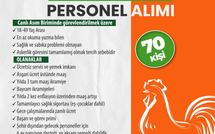 İnegöl Belediyesi İstihdam Merkezinden yapılan açıklamada, Banvit firmasında çalışmak üzere personel alımı yapılacağı duyuruldu. Açıklamada şu ifadelere yer verildi: “İstihdam Merkezimizle iş birliği yapan Banvit firması, Bandırma’da bulunan tavuk fabrikasında çalışacak canlı asım biriminde görevlendirilmek üzere personel alımı yapacak. Aranan genel şartlarda 18-49 yaş arası, en az okuma yazma bilen, sağlık ve sabıka problemi olmayan ve askerlik görevini tamamlamış olmak tercih sebebi olacak. Firma farklı şehirlerden gelecek personeller için çeşitli imkanlar da sunuyor. Ücretsiz servis ve yemek ikramı, asgari ücret üzerinde maaş, yılda 3 tam maaş ikramiye, bayram ikramiyeleri, yılda 2 kez enflasyon üzerinde maaş artışı, tamamlayıcı sağlık sigortası, gece çalışmalarında zamlı ücret, başarı ve görev primi, şehir dışından başvuru yapacaklar için akşam yemeği de dahil olmak üzere 6 ay pansiyon desteği olanakları sunuluyor.