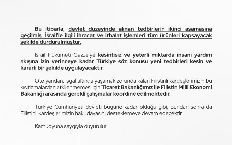 “İsrail’in sebep olduğu katliam, insani felaket ve fiziki yıkım devam etmiş, İsrail hükümeti uluslararası ateşkes çabalarını karşılıksız bırakmış ve insani yardımları engellemiştir” denilen açıklamada, “Türkiye, bunun üzerine 9 Nisan 2024 tarihinden itibaren geçerli olmak üzere, 54 ürün grubunun İsrail’e ihracatını kısıtlamıştır. Alınan bu kararda, İsrail Gazze’de derhal ateşkes ilan edene ve yeterli miktarda ve kesintisiz insani yardım akışına izin verinceye kadar kısıtlama tedbirlerinin yürürlükte kalacağı vurgulanmıştır. Buna rağmen, İsrail hükümetinin saldırgan tutumunu sürdürdüğü, Filistin’deki insani trajedinin kötüleştiği müşahede edilmektedir. Bu itibarla, devlet düzeyinde alınan tedbirlerin ikinci aşamasına geçilmiş, İsrail’le ilgili ihracat ve ithalat işlemleri tüm ürünleri kapsayacak şekilde durdurulmuştur. İsrail hükümeti, Gazze’ye kesintisiz ve yeterli miktarda insani yardım akışına izin verinceye kadar Türkiye söz konusu yeni tedbirleri kesin ve kararlı bir şekilde uygulayacaktır.” ifadeleri yer aldı.