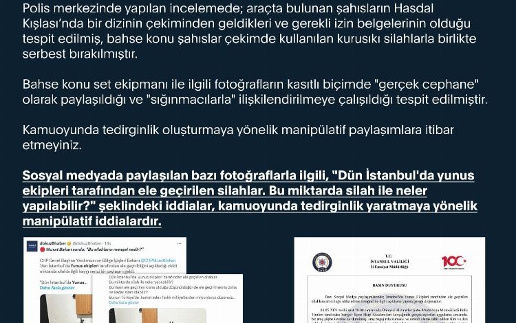 Açıklamada, “Polis merkezinde yapılan incelemede; araçta bulunan şahısların Hasdal Kışlası’nda bir dizinin çekiminden geldikleri ve gerekli izin belgelerinin olduğu tespit edilmiş, bahse konu şahıslar çekimde kullanılan kurusıkı silahlarla birlikte serbest bırakılmıştır” denildi.
