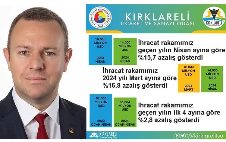 Kırklareli Ticaret ve Sanayi Odası (Kırklareli TSO) Yönetim Kurulu Başkanı Soner Ilık, 2024 yılı Nisan ayında Kırklareli’nden yapılan ihacatın 2024 yılının Mart ayına göre yüzde 16,8 azalış, 2023 yılının Nisan ayına göre ise yüzde15,7 azalış gösterdiğini belirtti.