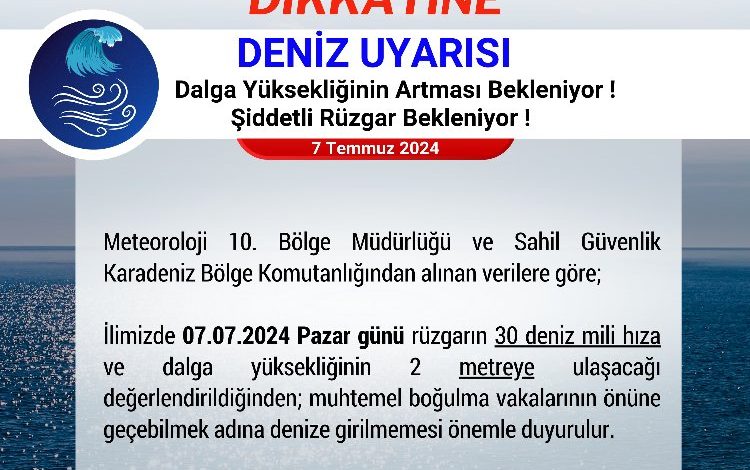 Valilikten yapılan yazılı açıklamada, Meteoroloji 10. Bölge Müdürlüğü ve Sahil Güvenlik Karadeniz Bölge Komutanlığı’ndan alınan verilere göre vatandaşları uyararak, ‘denize girmeyin’ çağrısında bulunuldu.